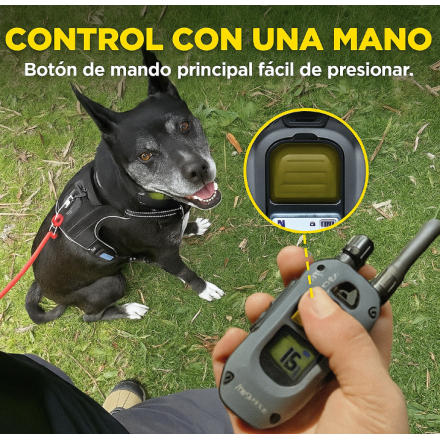 Controle fácilmente a su perro y capte toda su atención con el 640X, la nueva generación del collar electrónico 640C. Su diseño intuitivo y su botón de control central le garantizan no perder nunca el momento adecuado durante el adiestramiento de su perro. Además del sonido, la vibración y la función BOOSTER para un llamado rápido y eficaz, el 640X también está equipado con una luz integrada muy visible para los paseos nocturnos, y con un bloqueo de nivel para mayor seguridad. Resistente al agua y a los golpes, es perfecto para todas sus aventuras.