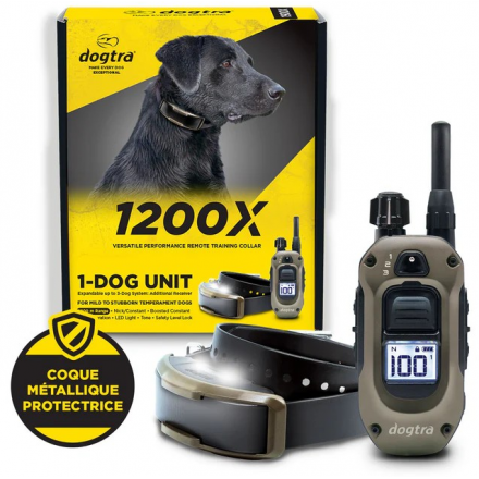 Dogtra 1200X: collar de adiestramiento profesional con 1.200 m de alcance, vibración avanzada XPP y carcasa metálica protectora.